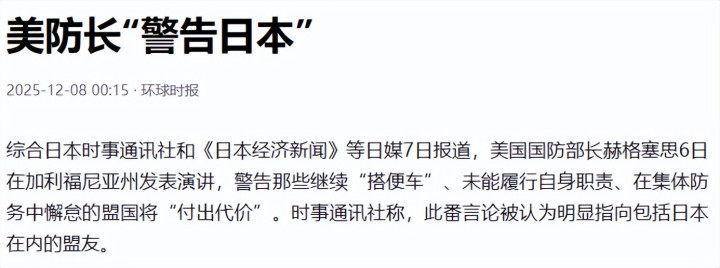 就在中日战机发生对峙的同一天,12月6日,美国国防部长赫格塞思正在加州发表演讲。